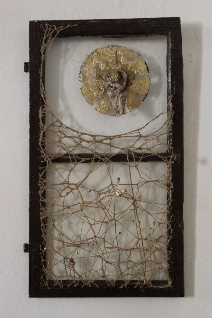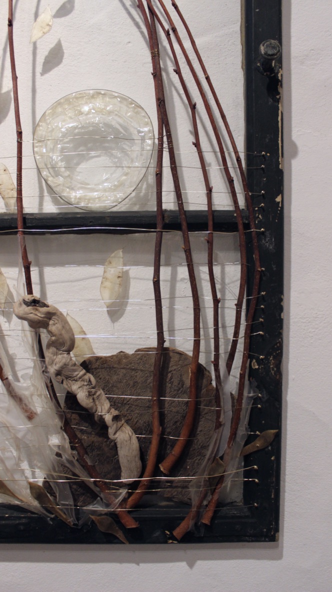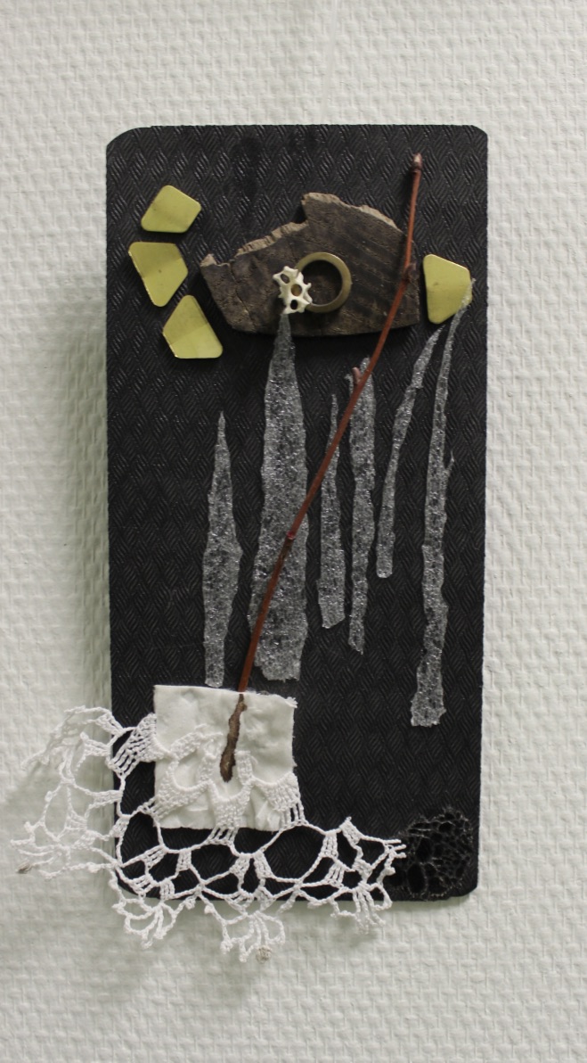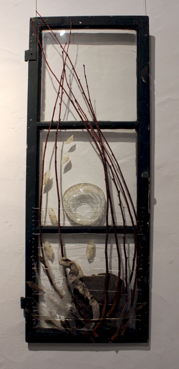 Fensterblick, Mischtechnik und Materialcollage auf Glas, 116 x 44 cm, 2018.Wiedergeburt, verschiedene Materialien und Blut auf Karton, 20 x 9 cm, 2019.Fensterblick, Mischtechnik und Materialcollage auf Glas, 116 x 44 cm, 2018.Kaffeekränzchen im Freien, Montage auf Glas und Mischtechnik, 42,5 x 63 cm, 2018.Mabon, Materialcollage im Bilderrahmen, 20,5 x 15 cm, 2017.Den Rahmen bespielen, Materialcollage, 45 x 43 cm, 2014.Durchdringung, Fenster, Draht, Schnur, diverse Materialien, 80 x 44,5 cm, 2015.Jäger und Sammler, Holz in Etui, 19 x 18,5 cm, 2017.