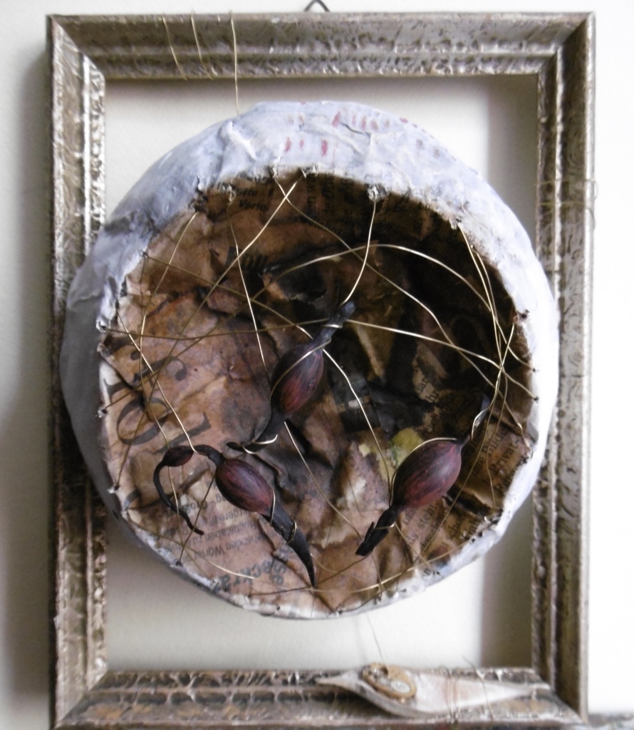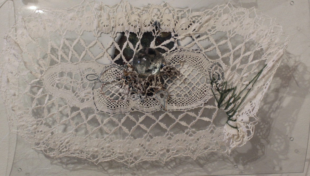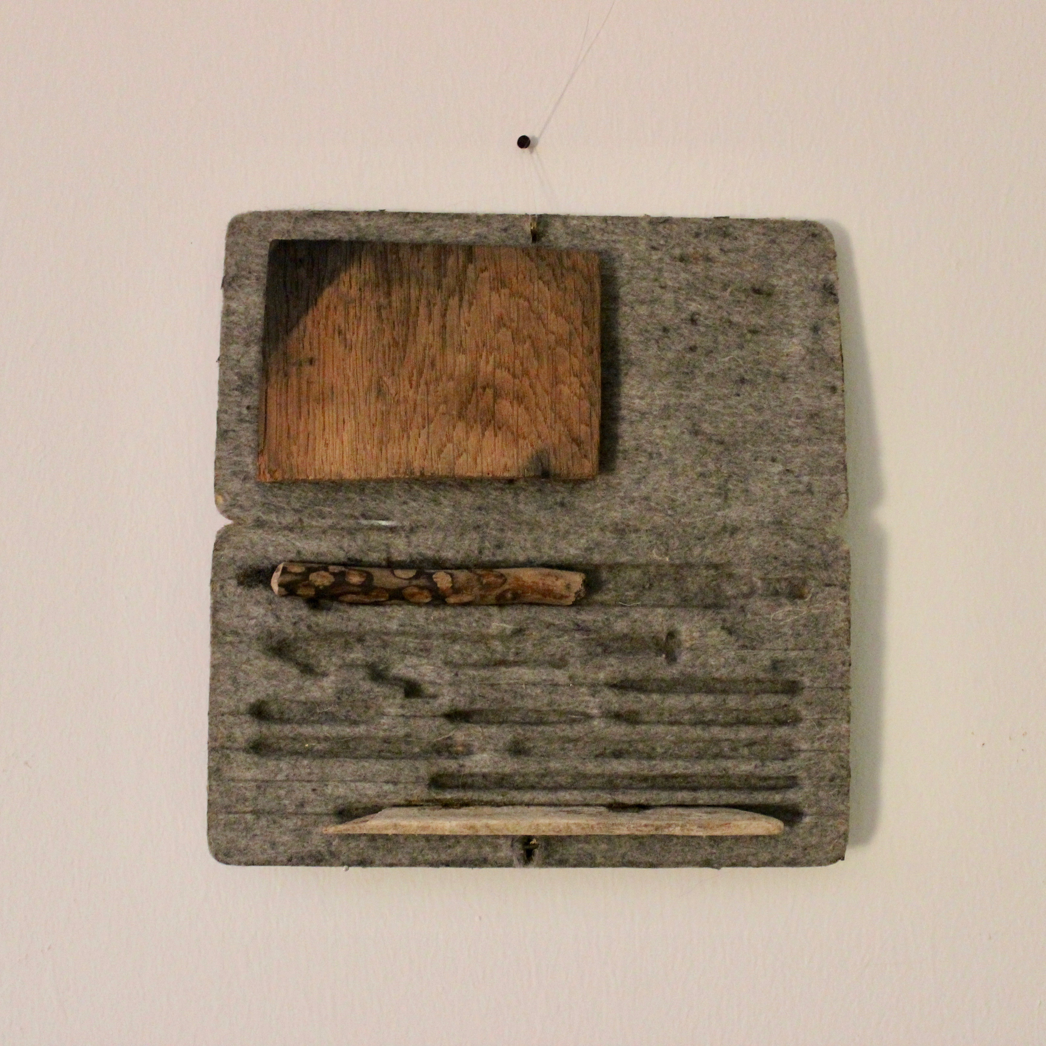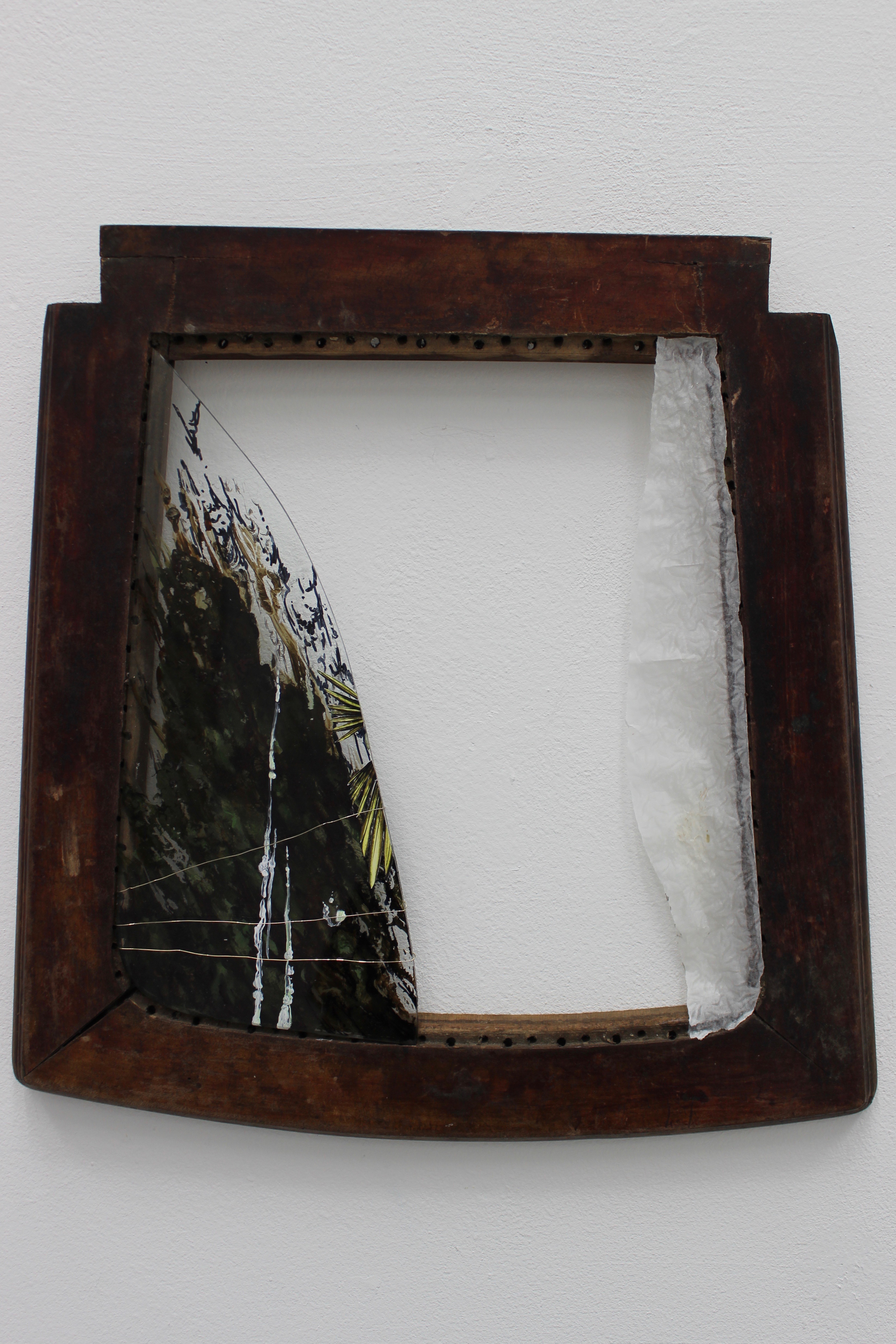 Fensterblick, Mischtechnik und Materialcollage auf Glas, 116 x 44 cm, 2018.Wiedergeburt, verschiedene Materialien und Blut auf Karton, 20 x 9 cm, 2019.Fensterblick, Mischtechnik und Materialcollage auf Glas, 116 x 44 cm, 2018.Kaffeekränzchen im Freien, Montage auf Glas und Mischtechnik, 42,5 x 63 cm, 2018.Mabon, Materialcollage im Bilderrahmen, 20,5 x 15 cm, 2017.Den Rahmen bespielen, Materialcollage, 45 x 43 cm, 2014.Durchdringung, Fenster, Draht, Schnur, diverse Materialien, 80 x 44,5 cm, 2015.Jäger und Sammler, Holz in Etui, 19 x 18,5 cm, 2017.