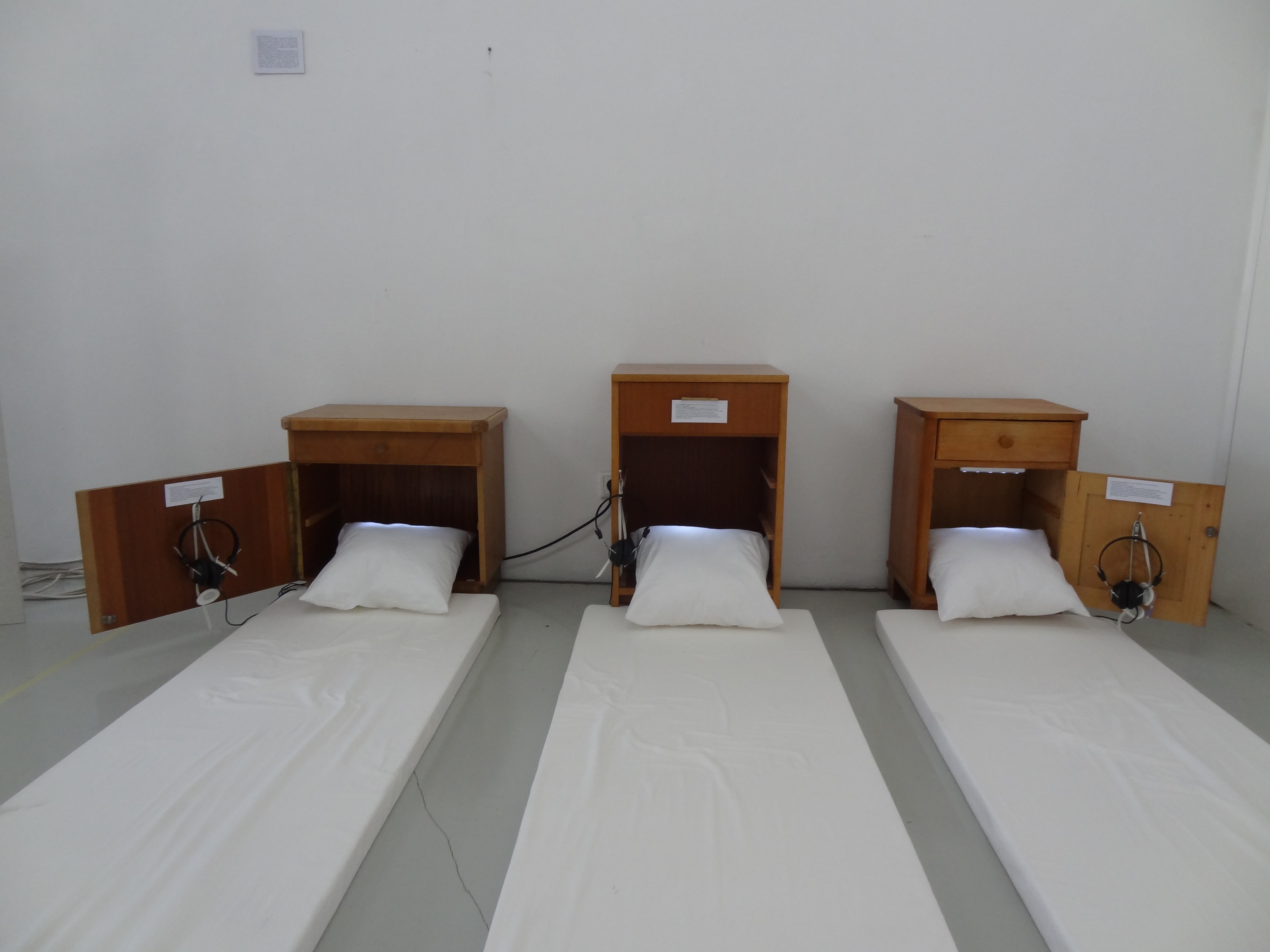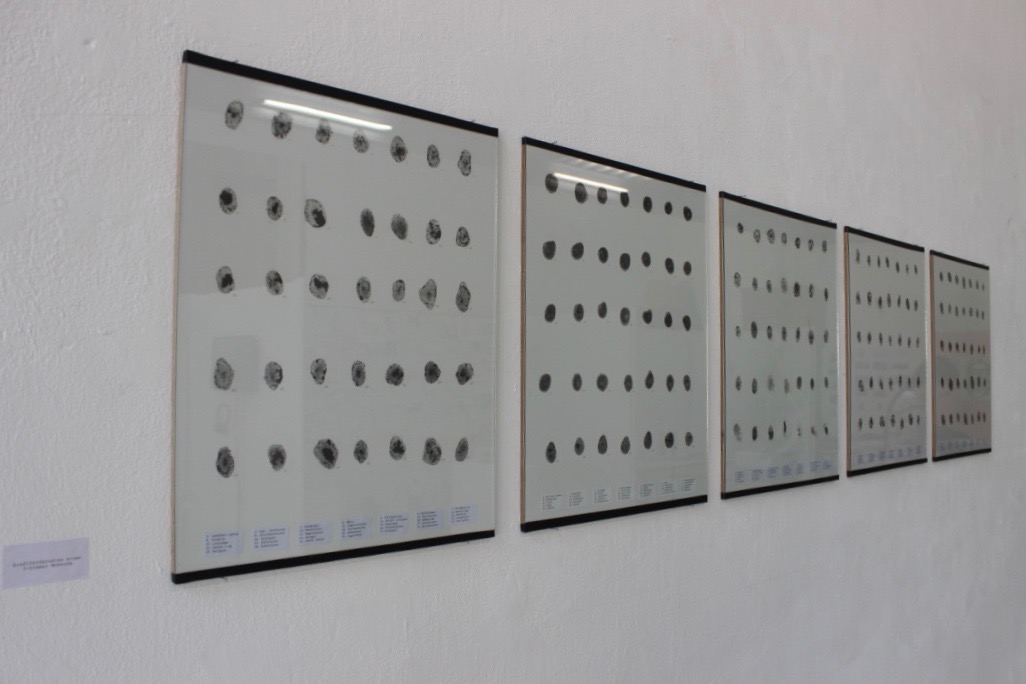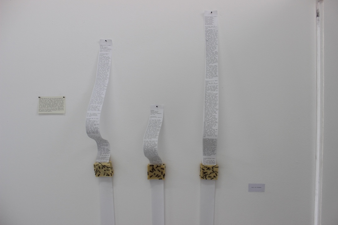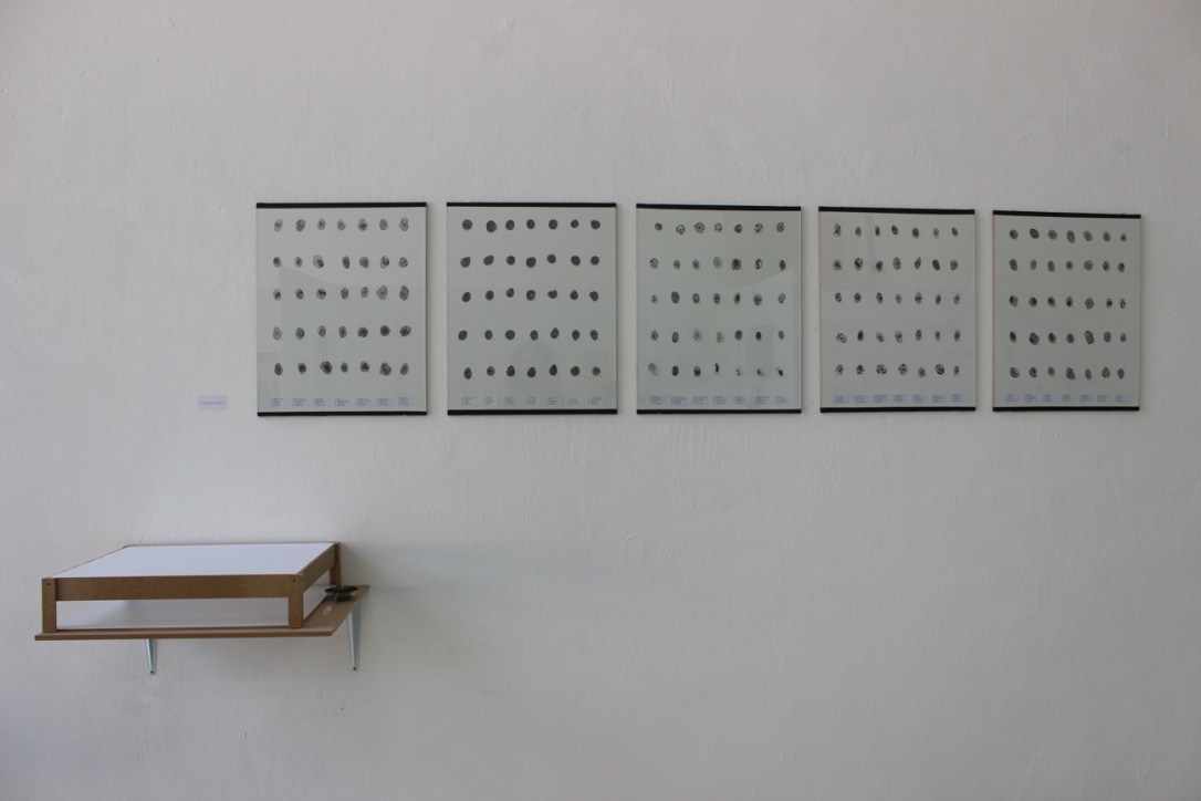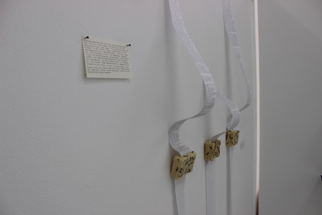 Ausstellungsansicht von „Vogelsang“, Vogelnester mit Eigenhaar, 2013-2014.Ganzfeldexperiment, Selbsterfahrungs- und Visionsraum unter sensorischer Deprivation, 2015.Kraftfeldstudien einer 3-Zimmer Wohnung, Graphitpulver auf MdF Platte, je 50 x 40 cm, 2014.Kraftfeldstudien einer 3-Zimmer Wohnung, Graphitpulver auf MdF Platte, je 50 x 40 cm, 2014.Ausstellungsansicht von „Verhörprotokolle“, auf Kassenzettel getippte Verhörprotokolle der Bamberger Hexenprozesse, gegossen in Seife, durchsetzt mit Nägeln, 2015.Ausstellungsansicht von „Verhörprotokolle“, auf Kassenzettel getippte Verhörprotokolle der Bamberger Hexenprozesse, gegossen in Seife, durchsetzt mit Nägeln, 2015.Ausstellungsansicht von „Verhörprotokolle“, auf Kassenzettel getippte Verhörprotokolle der Bamberger Hexenprozesse, gegossen in Seife, durchsetzt mit Nägeln, 2015.